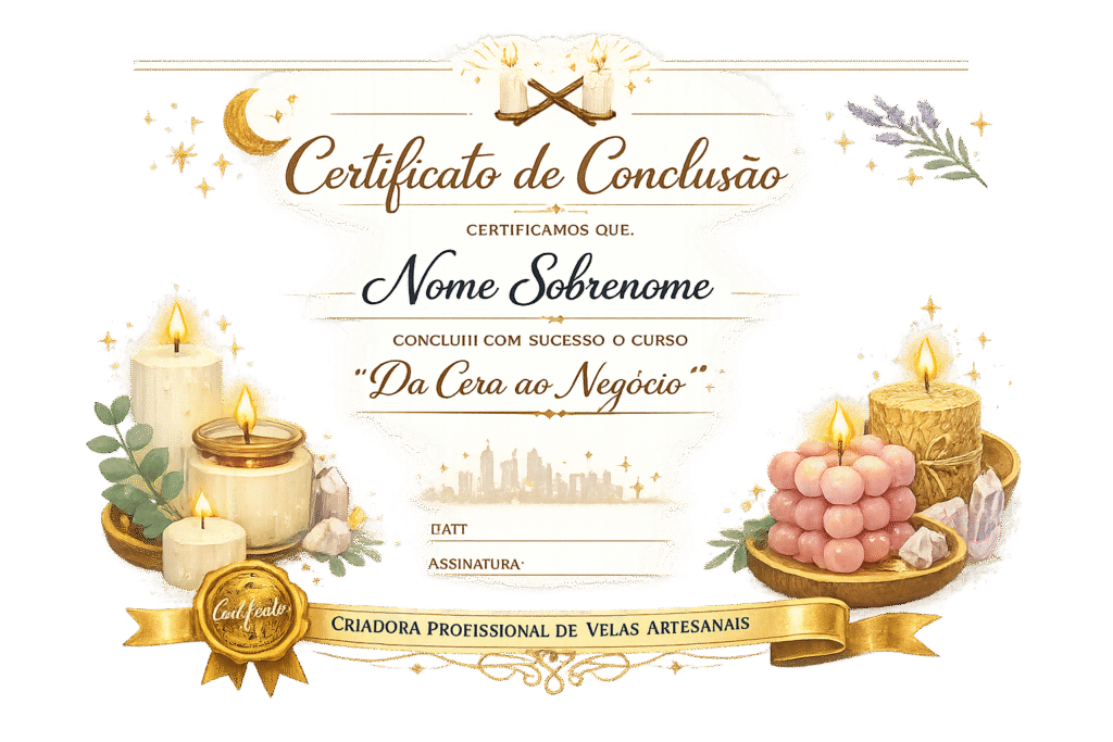 ✅ E ainda, vais receber estratégias testadas e comprovadas para te destacares no mercado de velas artesanais — começando a gerar um rendimento extra real com as tuas criações.